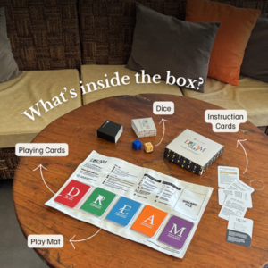 Play Modes: DREAM & DARE can be played solo, with a partner, amongst small and large groups. The crowd favorite is the board game for groups of 2-8 people. Set Inclusion: 1 deck of cards (60 DREAM cards and 5 instruction cards), 1 two-sided play mat, and 2 dice (DREAM & Play). To order your own set (and more!), go to mgtstrat-shop.com. Follow us on Instagram @letsdreamanddare and Facebook at DREAM & DARE.